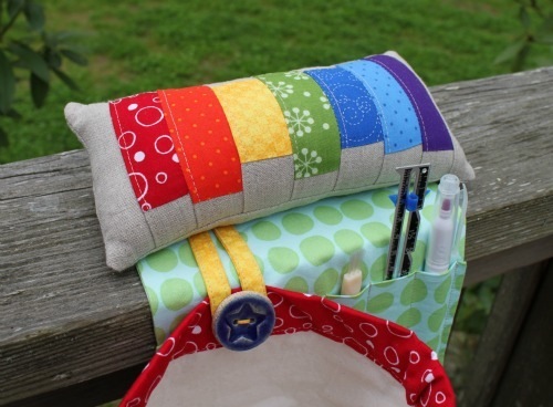 Amy (from Ameroonie Designs) and I are celebrating our birthdays all week by sharing projects that we made just for us. Monday I shared my 241 tote bag. Yesterday I shared my patchwork camera strap cover. Today I’m sharing my scrappy pin cushion/organizer.